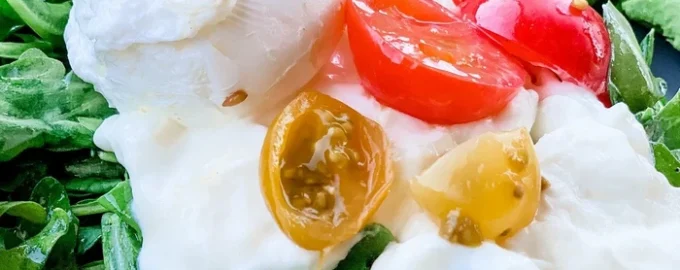 A saláta alapja a lágy, puha burrata sajt krémes töltelékkel, lédús paradicsommal, rukkolával és olívaolajból és balzsamecetből készült öntettel.